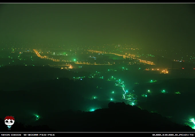 其中一張一分鐘的曝光,蜿蜒的山間小路上正巧車輛經過,如一條臥在山嶺間的螢光龍,蠻漂亮的呢 :)
