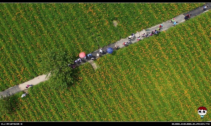 從天空看澄黃色的金針花,成了噴槍效果的塗料,一朵朵的陽傘在田間依序移動著,很可愛!^^